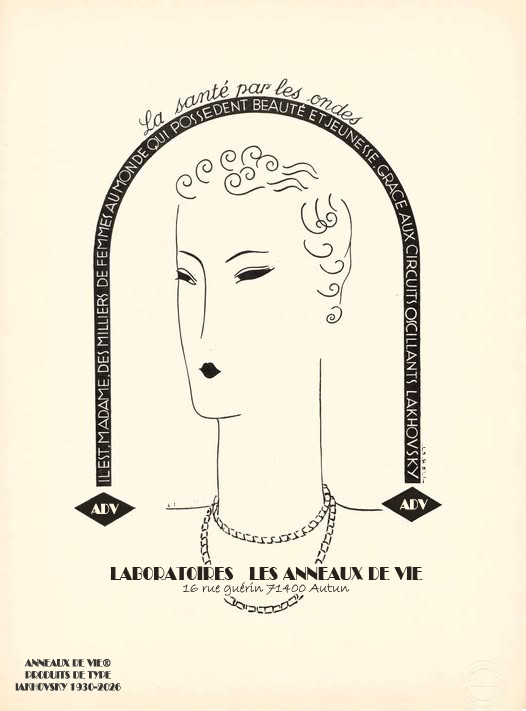 Les colliers, circuits oscillants, ont une action directe sur la gestion des ondes électromagnétiques qui parcourent notre corps. Leurs bénéfices, selon G. Lakhovsky, sont aussi tout aussi visibles dans l’énergie retrouvée que sur la qualité de la peau. (image ci-dessous issues des publicités pour les colliers Lakhovsky vers 1930)